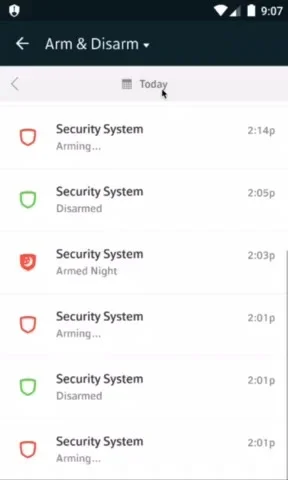 History feature allows users to track device activity and security alarms and created video and photos from events. The user can scroll through the timeline to view their events in sequence of use filtering to expose specific information such as alarm events. The user can also filter by device of security zone to view groups of devices like the house perimeter and see device status (low battery).